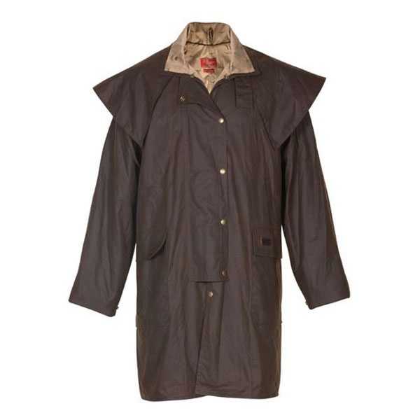 The R.M Williams Rouseabout Coat was created with a water resistant wax outer and longer length for additional coverage, this highly practical winter jacket provides the ultimate protection on a rainy day. It features an oilskin waxed outer which is water resistant. It has zippered & studded closure with storm flap, an adjustable tab on cuff, shoulder cape for extra weather protection, back vent for horse riding functionality and a steer’s head jacquard lining.